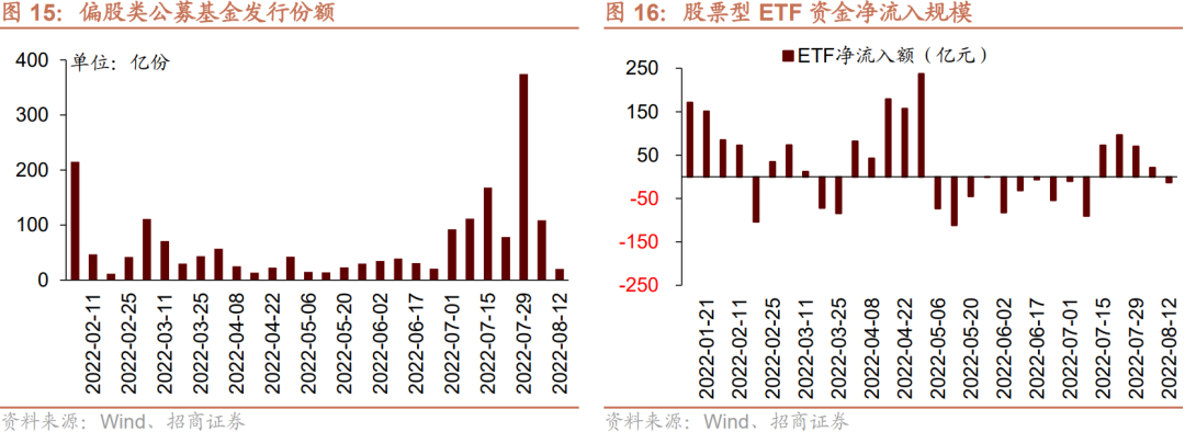 资金供给方面,8月8日-8月12日,新成立偏股类公募基金20.1亿份,较前期减少88.7亿份。股票型ETF较前期净流出,对应净流出13.4亿元。全周整个市场融资净买入77.4亿元,从前期净流出转为净流入,截止8月12日,A股融资余额为15223.2亿元。陆股通本周净流入,当周净流入规模为76.5亿元,从前期净流出转为净流入。