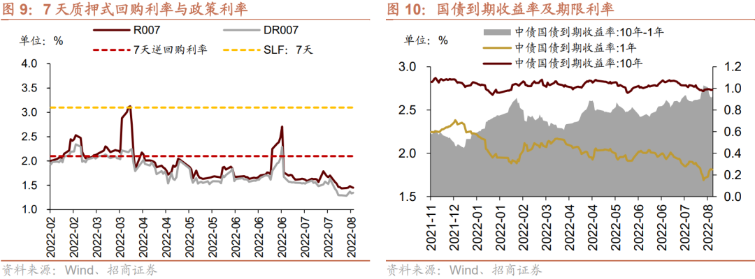 货币市场利率上行,R007与DR007利差缩小;短、长端国债收益率上行,期限利差缩小。截至8月12日,R007为1.45%,较前期上行1.4bp,DR007为1.35%,较前期上行5.2bp,两者利差缩小3.8bp至0.10%。1年期国债到期收益率上升10.0bp至1.81%,10年期国债到期收益率上升0.1bp至2.73%,期限利差缩小9.9bp至0.92%。