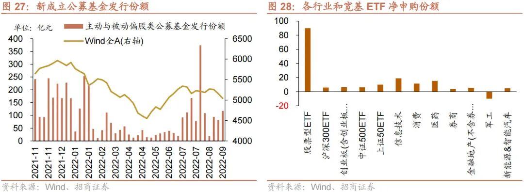 从ETF净申购来看,ETF净申购,宽指ETF均为净申购,其中上证50ETF申购最多;行业ETF以净申购为主,其中信息技术ETF申购较多,军工ETF赎回较多。具体来看,股票型ETF总体净申购90.0亿份。其中,沪深300、创业板ETF、中证500ETF、上证50ETF和双创50ETF分别净申购5.8亿份、净申购6.3亿份、净申购6.1亿份、净申购10.0亿份、净申购3.5亿份。行业方面,信息技术ETF净申购19.0亿份;消费ETF净申购11.5亿份;医药ETF净申购15.4亿份;券商ETF净申购3.9亿份;金融地产ETF净申购5.3亿份;军工ETF净赎回10.0亿份;原材料ETF净赎回0.6亿份;新能源&智能汽车ETF净申购4.9亿份。