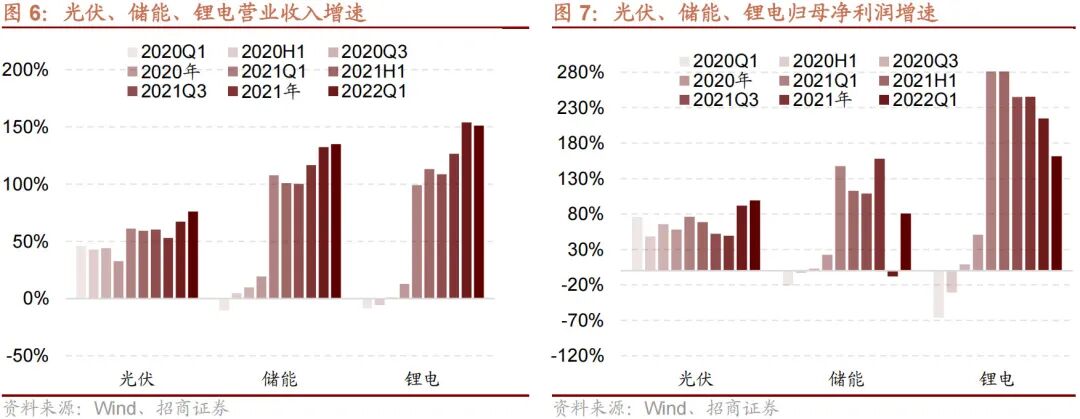 光伏、锂电、储能等新能源产业链核心环节,中报业绩表现突出。我们选取典型企业整体法计算,光伏、储能、锂电领域营业收入增速分别为76.0%、134.9%、151.2%,其中光伏、储能创近十个季度以来的新高。光伏上半年装机量高速增长是板块业绩强劲的主要支撑,一方面,近期传统能源短缺将进一步提升新能源的建设;另一面方面光伏领域自身技术不断叠代创新,光伏光电转换效率不断提升;锂电主要受益于下游需求的高增长,叠加部分原材料价格的提升。