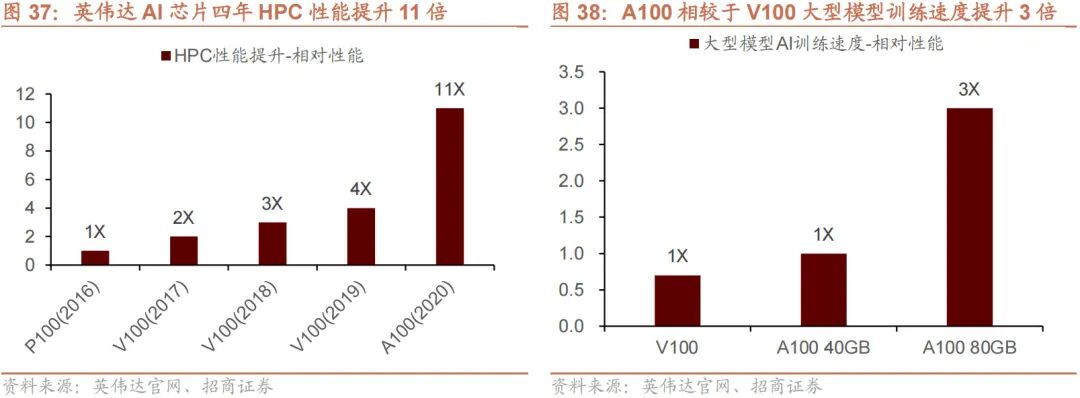 英伟达A100几乎统治全球智能数据中心市场,每一代训练芯片性能均有大幅提升。英伟达A100 GPU,基于Ampere架构,采用7nm制程,其芯片面积是826平方毫米,晶体管数量542亿颗,TDP(热设计功耗)为400W,FP32峰值算力为19.5TFLOPS。2022年3月发布的H100,采用全新的Hopper架构,台积电4N工艺制造,拥有800亿个晶体管,搭载了HBM3显存,片上带宽为4.9TB/s,显存容量为80G。在大型模型AI训练方面,H100相较于A100可有9倍提升,A100 80GB相较于V100可有超过4倍提升,在大型模型AI推理方面,H100相较于A100提升可达30倍,在HPC应用性能方面,2016-2020的仅仅四年提升了11倍。
