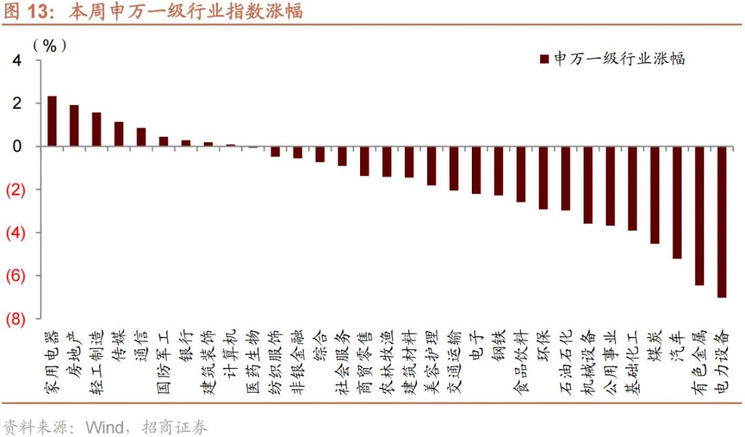 从行业上来看,本周申万一级行业多数下跌,9个一级行业上涨,家电、房地产、轻工制造涨幅居前,电力设备、有色、汽车跌幅居前。从涨跌原因来看,本周涨幅居前的行业原因主要为,家电、房地产、轻工制造(随着前期因城施策的支持刚需和改善需求的政策推出,以及下调LPR利率,近期地产销量在去年低基数背景下改善,729政治局会议明确提出“保交楼”,助于地产竣工和地产后周期消费的边际改善),跌幅居前的行业原因主要为,电力设备、有色、汽车(主要为泛新能源,近期伊朗扩产预期、欧洲入冬前的博弈,对原油、天然气价格下行预期使得风光储估值波动)。