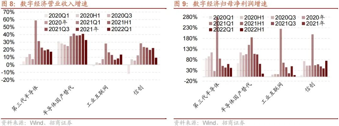 同样我们选取典型公司采用整体法计算,数字经济领域业绩表现相对较好的主要有第三代半导体、半导体国产替代、工业互联网和信创领域,归母净利润增速分别为42.2%、14.7%、7.9%、75.3%,其中信创归母净利润增速较一季度显著扩大。在制造业加速智能化转型的背景下,工业互联网领域业绩增速中枢上移。