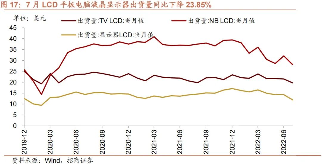 7月LCD显示器出货量同比下降。7月份TV LCD出货量为19.7百万,同比减少4.37%,月环比下降8.37%;LCD NB出货量为28.10百万,同比下降23.85%,月环比下降12.46%;LCD显示器出货量为11.90百万,同比下降16.2%,月环比下降16.78%。