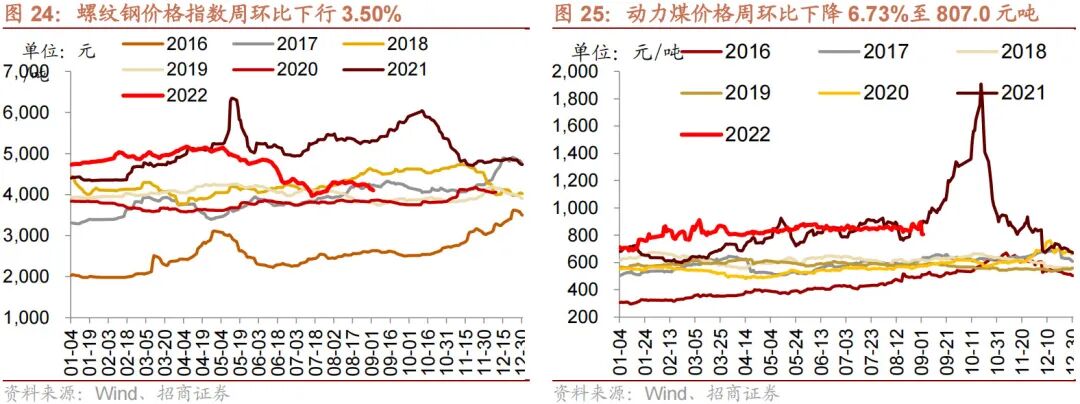 焦煤、焦炭、动力煤期货价格下降。截至9月2日,焦炭期货价格周环比下行8.75%至2424.0元/吨,焦煤期货价格周环比下行9.52%至1816.0元/吨,动力煤期货价格周环比下降6.73%至807.0元/吨。