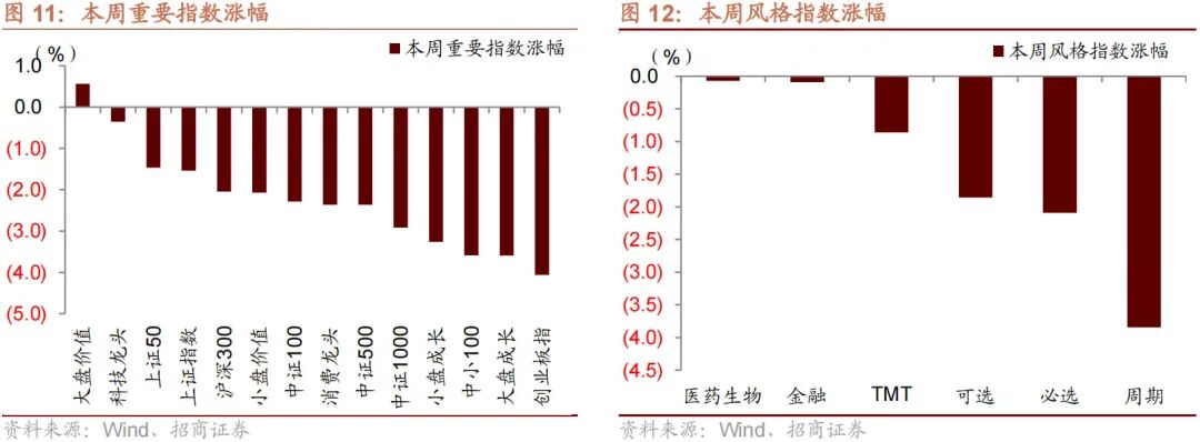 本周A股主要指数多数下跌,主要指数中大盘价值指数上涨,创业板指、大盘成长、中小100指数跌幅居前,本周日均成交8457.1亿元,较上周相比明显缩量。南向资金本周净流入港股43.0亿港币,北向资金本周净流入A股4.4亿人民币。风格方面,周期跌幅较深,医药生物、金融风格跌幅较小。