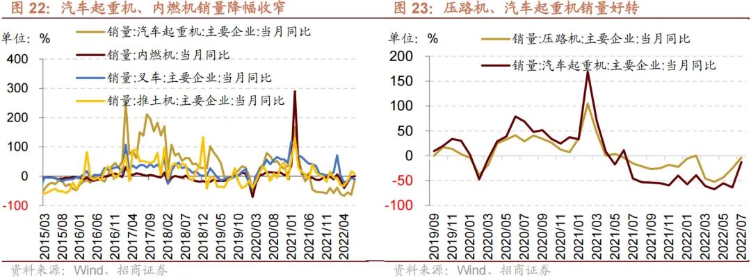 主要工程机械类设备销量回暖。7月推土机销量同比增速为8.42%,较上月增幅减少7.58个百分点;装载机销量同比增速为-6.38%,较上月降幅收窄1.92个百分点;叉车销量同比增速为-9.73%,较上月降幅扩大2.9个百分点;压路机销量同比增速为-3.80%,较上月降幅收窄21.3个百分点;内燃机销量同比增速为0.39%,增速由负转正;汽车起重机销量同比增速为-12.70%,较上月降幅收窄51个百分点。
