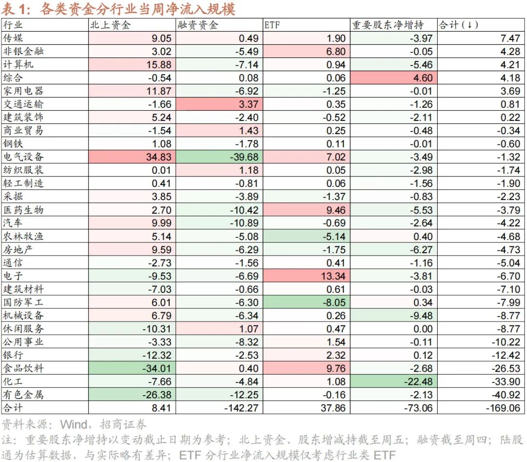 【资金·众寡】融资净流出,ETF净申购。北上资金本周净流入4.4亿元;融资资金前四个交易日合计净流出138.8亿元;新成立偏股类公募基金117.6亿份,较前期上升35.1亿份;ETF净申购,对应净流入144.6亿元。行业偏好上,北上资金净买入规模较高的为电气设备、计算机、家用电器等;融资资金净买入交通运输、商业贸易、纺织服装等;信息技术ETF申购较多,军工ETF赎回较多。重要股东净减持规模扩大,计划减持规模下降。