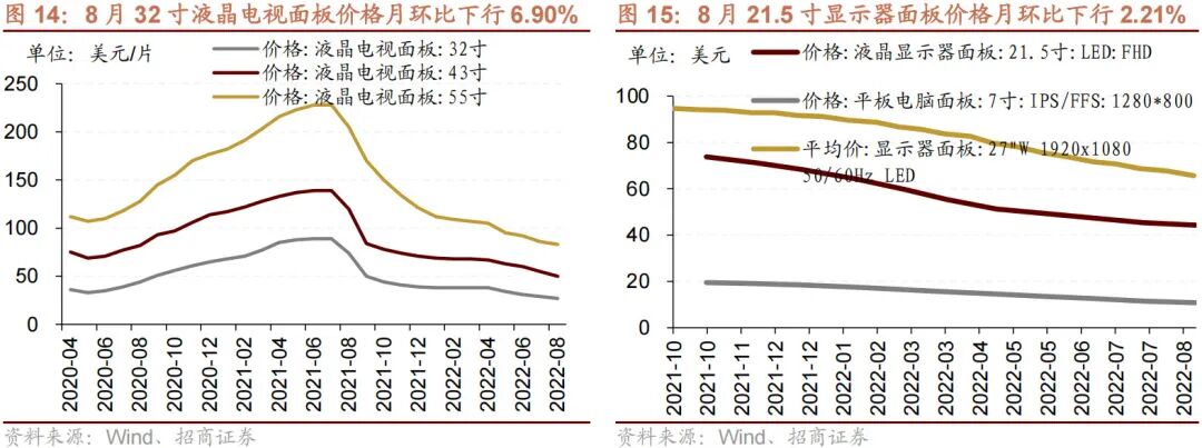 8月份液晶板价格月环比下降。截至8月31日,液晶电视面板方面,32寸液晶电视面板价格为27.00美元/片,月环比下降6.90%;43寸液晶电视面板价格为50.00美元/片,月环比下降9.09%;55寸液晶电视面板价格为83.00美元/片,月环比下降3.49%。本周液晶显示器方面,21.5寸液晶显示器面板价格为44.30美元/片,环比下降2.21%;7寸平板电脑面板价格为10.80美元/片,环比下降6.09%。