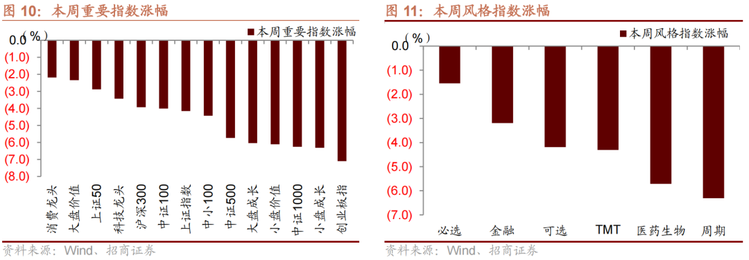 本周A股主要指数多数下跌,主要指数中创业板指、小盘成长、中证1000跌幅居前,消费龙头、大盘价值、上证50跌幅相对较小,本周日均成交8034亿元,较上周相比持平。南向资金本周净流入港股107.1亿港币,北向资金本周净流出A股60.9亿人民币。风格方面,周期、医药生物跌幅居前,必选相对抗跌。