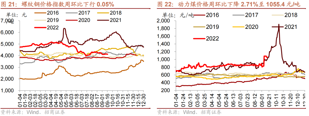 焦煤、焦炭期货价格上涨,动力煤期货价格下降。截至9月16日,焦炭期货价格周环比上行3.57%至2609.0元/吨,焦煤期货价格周环比上行6.58%至1999.0元/吨,动力煤期货价格周环比下降2.71%至1055.4元/吨。
