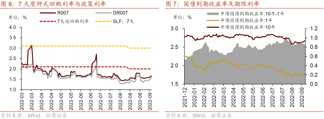 ⚑ 9月银行体系流动性边际收敛。根据测算,2022年8月超额流动性同比增速小幅提升至16.77%,显示8月银行体系流动性总体仍处于宽松的状态,主要原因在于去年同期低基数叠加政府性存款的减少,财政仍在持续发力。央行9月MLF缩量平价续作4000亿元,央行边际回收市场流动性。近期货币市场利率持续上行,R007与DR007持续向政策利率靠近,反映融资需求边际改善,预计9月新增社融较8月会有进一步改善。对A股而言,A股所面临的宏观环境有望从“流动性驱动”逐渐转向“社融驱动”,从而带动短期市场风格更加均衡。