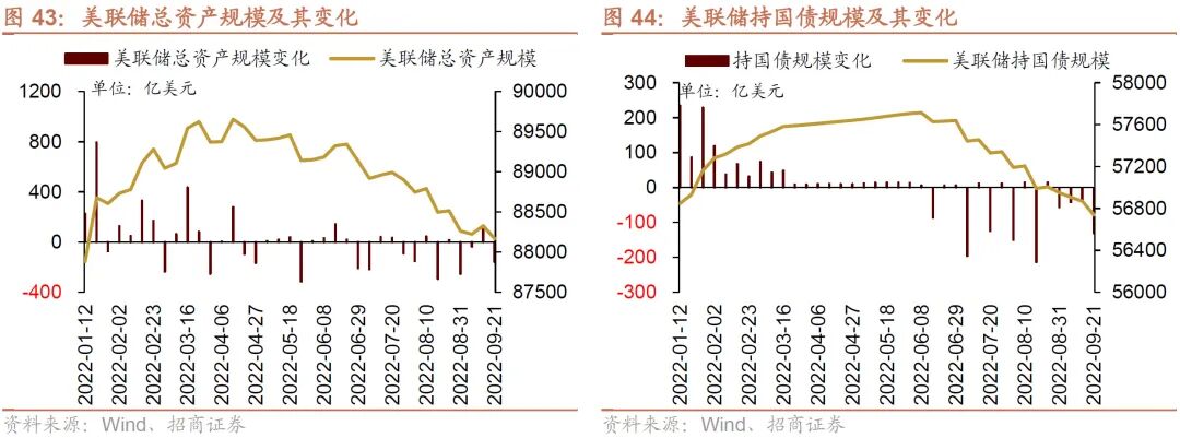 最近一周美联储总资产规模缩小。截至9月21日,美联储持有资产规模88168.02亿美元,相比前期(9月14日)缩小159.57亿美元。其中,持有国债规模56739.19亿美元,相比前期缩小131.12亿美元。