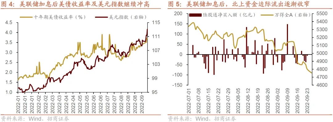 ⚑ 美联储鹰派加息预期引领美元指数和美债收益率冲高。上周美联储9月议息会议声明高度重视通货膨胀风险,继续上调通胀和失业率预期、大幅下调GDP预期。9月美联储决定继续加息75bp,后续加息路径及最终利率水平偏鹰超出市场预期,会后菲律宾、英国、挪威、瑞士、印尼等国央行也纷纷加息。从市场表现来看,美联储议息会议后,长端美债收益率与美元指数快速冲高,北上资金边际流出放缓。往后看,此轮加息已临近美联储年内鹰派加息顶峰,四季度大概率看到加息节奏放缓,待后续美国通胀压力得到缓解,美债收益率加速回落更有利于A股表现。当前全球经济正逐渐走向下行周期,目前国内融资结构正逐渐改善,基建投资大幅回升、制造业投资反弹,驱动国内经济复苏。在此情况下,外资有望回流A股。