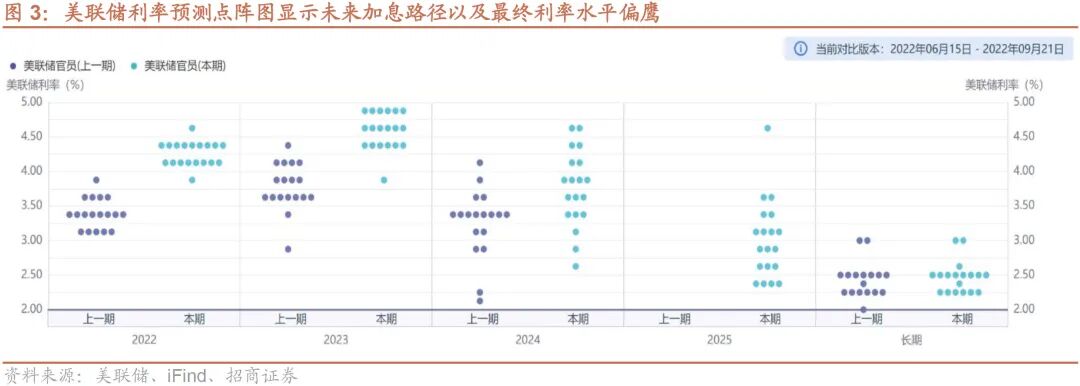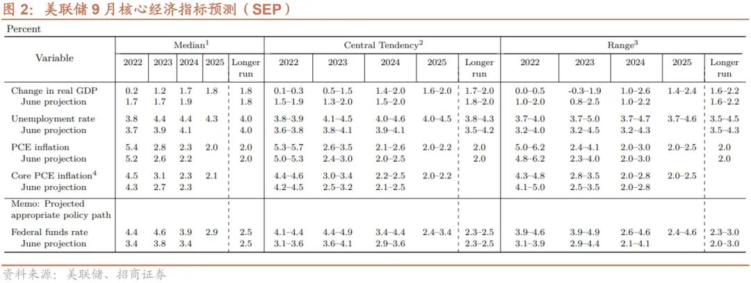 (2)经济预期:继续上调通胀和失业率预期、大幅下调GDP预期。相比6月的预测,美联储6月调低了2022年的经济增速预期(1.7%→0.2%),同时继续调高了2022年的通胀预期(PCE:5.2%→5.4%;核心PCE: 4.3%→4.5%)和失业率预期(3.7%→3.8%)。
