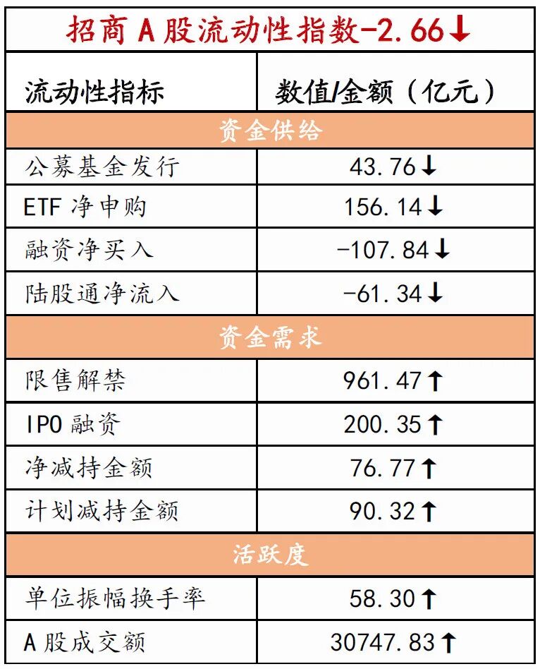 ⚑ 股市方面,A股二级市场可跟踪资金供需净流出规模收窄。北上资金流出,净流出61.3亿元;融资余额下降,融资资金净卖出107.8亿元;ETF净流入156.1亿元;新成立偏股类公募基金份额减少。重要股东净减持规模上升,公布的计划减持规模扩大。
