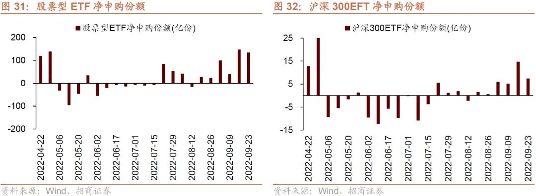 9月19日-9月23日,ETF净申购,当周净申购134.7亿份,宽指ETF均为净申购,其中创业板(含创业板50)ETF申购最多;行业ETF以净申购为主,其中医药ETF申购较多,军工ETF赎回较多。具体的,沪深300ETF净申购7.4亿份;创业板ETF净申购13.4亿份;中证500ETF净申购3.1亿份;上证50ETF净申购10.7亿份。双创50ETF净申购5.5亿份。行业方面,信息技术ETF净申购18.1亿份;消费ETF净申购5.1亿份;医药ETF净申购30.3亿份;券商ETF净申购13.5亿份;金融地产ETF净赎回1.5亿份;军工ETF净赎回1.7亿份;原材料ETF净申购0.1亿份;新能源&智能汽车ETF净申购3.9亿份。