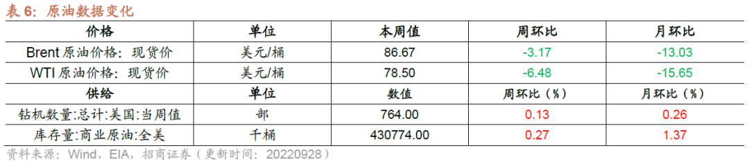 Brent国际原油价格下行。截至2022年9月27日,Brent原油现货价格周环比下行3.17%至86.67元/桶,WTI原油价格下行6.48%至78.50美元/桶。在供给方面,截至2022年9月23日,美国钻机数量当周值为764部,较上周增加0.13%;截至2022年9月16日,全美商业原油库存量周环比上行0.27%至4.31亿桶。