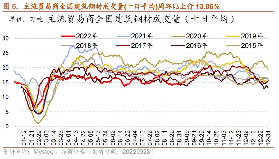 建筑钢材成交量十日均值周环比上行。9月27日主流贸易商全国建筑钢材成交量为27.69万吨;从过去十日移动均值情况来看,主流贸易商全国建筑钢材成交量十日均值为18.67万吨,周环比上行13.86%。