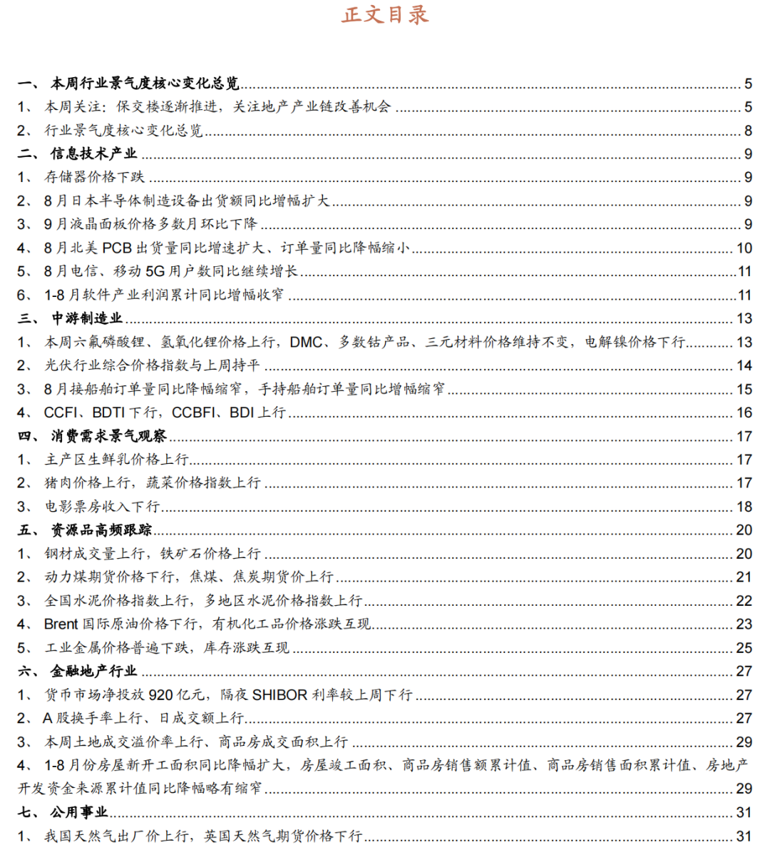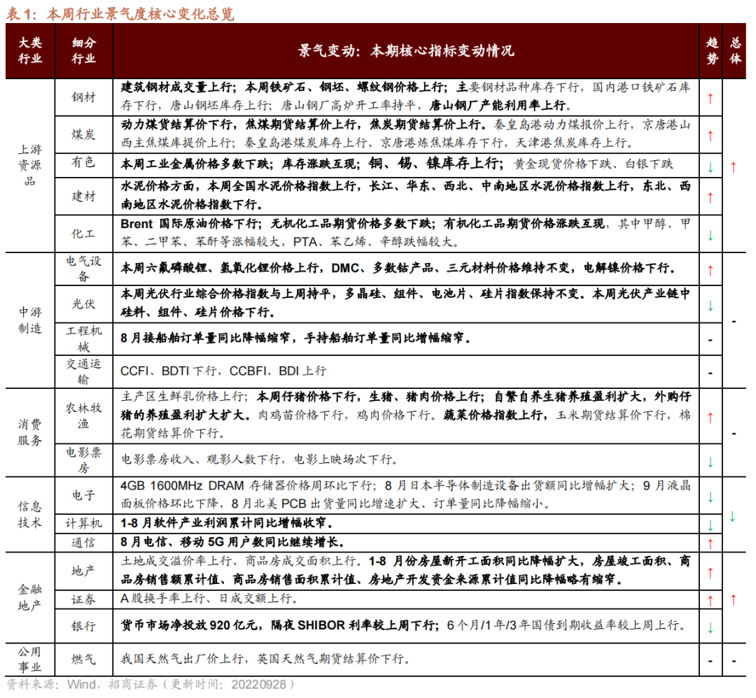 近期随着高温天气过去,“保交楼”稳步推进,基建实物工作量逐渐形成,基建链、地产链景气度逐渐上行,本周建材成交量明显提升、水泥价格上涨、玻璃库存小幅去化,下游家具、家电等景气度有望继续传导。同时,上游资源品领域钢铁、煤炭维持较高景气度;消费服务领域生猪养殖景气度较高;金融地产领域景气度有较大改善。推荐后续关注地产链、基建链以及景气度回升的消费养殖部分领域。