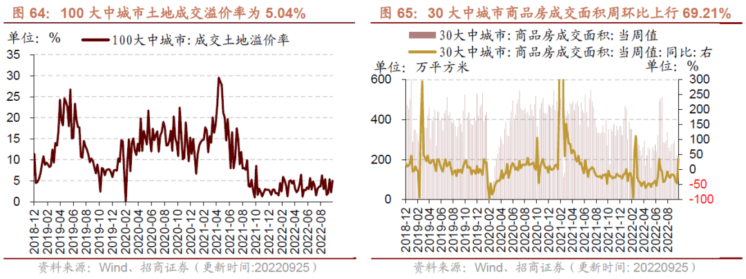 本周土地成交溢价率上行、商品房成交面积当周值上行。截至9月25日,100大中城市土地成交溢价率为5.04%,较上周上行2.83个百分点;截至9月25日,30大中城市商品房成交面积当周值为371.39万平方米,较上周上行69.21%。