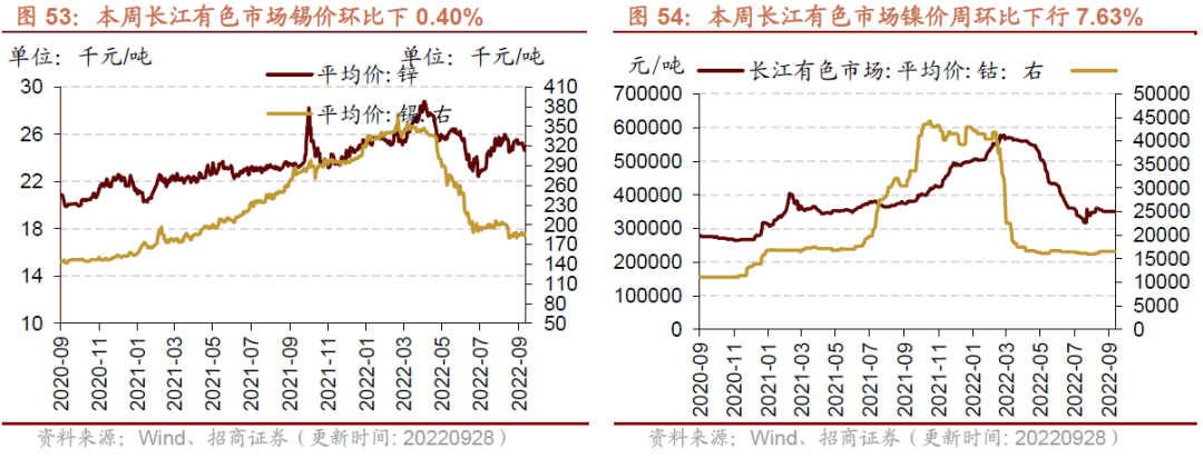 本周工业金属价格普遍下跌;库存涨跌互现,铜、锡、镍库存上行。截至9月28日,锡价格较上周下行0.40%为186000.0元/吨;钴价格较上周下行0.28%为350000.0元/吨;铅价格14900.0元/吨,周环比下行0.67%;铝价格周环比下行3.18%至17950.0元/吨;铜价格61550元/吨,周环比下行2.89%;长江有色市场锌价格为24260.0元/吨,周环比下行3.65%;长江有色金属镍价格周环比下行7.63%至185950.0元/吨。
