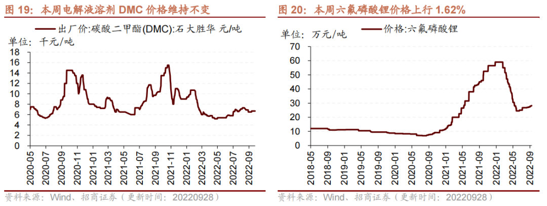 本周六氟磷酸锂、氢氧化锂价格上行,DMC、多数钴产品、三元材料价格维持不变,电解镍价格下行。在电解液方面,截至9月28日,电解液溶剂DMC价格维持在6700.0元/吨;六氟磷酸锂价格维持在28.25万元/吨。在正极材料方面,截至9月28日,电解镍Ni9996现货平均价周环比下行6.66%至189250.0元/吨;电解锰市场平均价格维持在16600.0元/吨。在锂原材料方面,截至9月28日,氢氧化锂价格周环比上行1.43%至496500.0元/吨;电解液锰酸锂价格维持在5.0万元/吨;电解液磷酸铁锂价格维持在6.25万元/吨;三元材料价格周环比上涨0.61%至327.75元/千克;钴产品中,截至9月28日,钴粉价格维持在360.0元/千克;氧化钴价格维持在239.5元/千克;四氧化三钴价格维持在242.5元/千克;电解钴价格维持在350000.0元/吨。