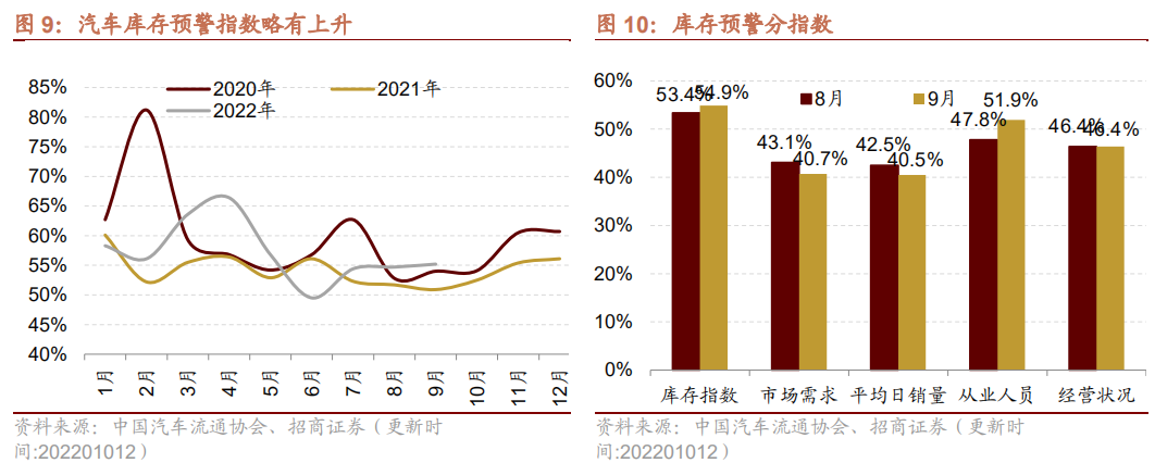汽车库存预警指数略有回升。近期中国汽车流通协会发布最新一期“中国汽车经销商库存预警指数调查”,数据显示2022年9月中国汽车经销商库存预警指数为55.2%,同比上升4.3个百分点,环比上升0.5个百分点,库存预警指数位于荣枯线以上。调查显示,9月处于旺季叠加季末考核冲量,经销商进车任务和库存增加,目前经销商库存存在部分紧俏车型资源紧张、库存车占用资金比例较大、新车价格倒挂等问题。分项来看,9月库存、从业人员指数环比上升,市场需求、平均日销量指数环比下降,经营状况指数持平。后续随着销量继续向好,库存压力有望缓解。根据调查8.9%的经销商认为四季度车市销量在20%以上,34.6%的经销商认为四季度同比增长5%-20%,54.5%的经销商认为车辆购置税减免政策在12月将达到最高点,对市场拉动作用最显著。