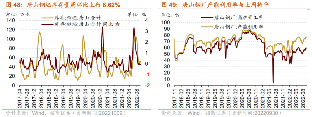 本周铁矿石、钢坯价格下行,螺纹钢价格上行;主要钢材品种库存下行,国内港口铁矿石库存下行,唐山钢坯库存上行;唐山钢厂高炉开工率、唐山钢厂产能利用率与上周持平。产量方面,截至9月30日,重点企业粗钢日均产量为214.50万吨/天,与上一旬持平,全国粗钢预估日均产量为284.36万吨/天,旬环比下行0.47%。价格方面,截至10月11日,螺纹钢价格为4183.00元/吨,相比节前环比上行0.31%;截至10月11日,钢坯价格3698.00元/吨,相比节前环比下行0.16%;截至10月11日,铁矿石价格指数为358.93,相比节前环比下行0.44%。库存方面,截至9月26日,国内港口铁矿石库存量为13185.00万吨,周环比下行3.90%;截至10月9日,唐山钢坯库存量为52.30万吨,相比节前环比上行8.62%;截至9月30日,主要钢材品种库存周环比下行4.22%至1042.47万吨。产能方面,截止9月30日,唐山钢厂高炉开工率59.52%,与上周持平;唐山钢厂产能利用率77.06%,与上周持平。