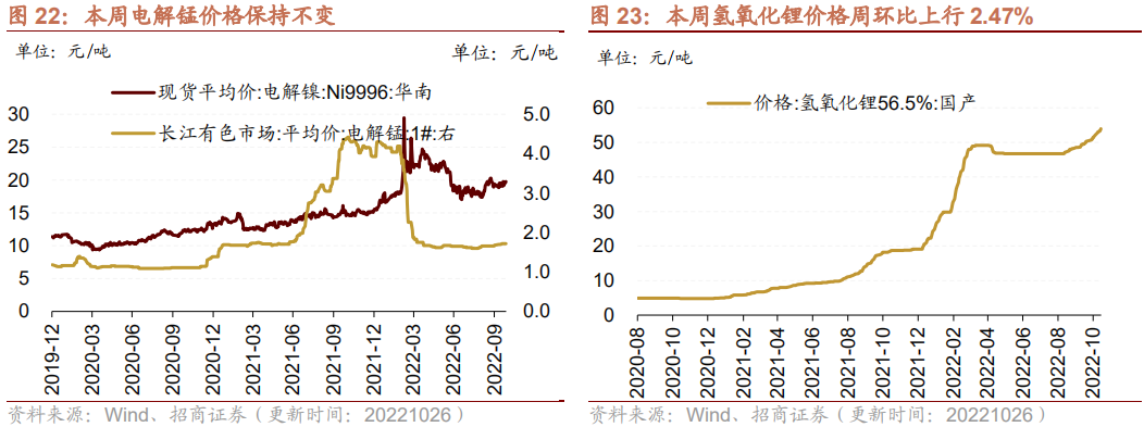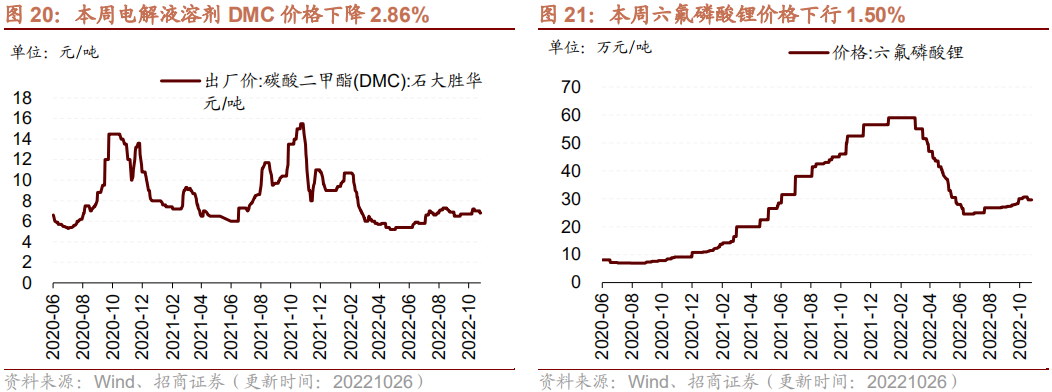 本周DMC、六氟磷酸锂价格下行,氢氧化锂、电解镍价格上行,多数锂材料、钴产品价格维持不变。在电解液方面,截至10月26日,电解液溶剂DMC价格周环比下降2.86%至6800.0元/吨;六氟磷酸锂价格周环比下降1.50%至29.65万元/吨。在正极材料方面,截至10月26日,电解镍Ni9996现货平均价周环比上行1.94%至197500.0元/吨;电解锰市场平均价格维持在17200.0元/吨。在锂原材料方面,截至10月26日,氢氧化锂价格周环比上行2.47%至539500.0元/吨;电解液锰酸锂价格维持在5.11万元/吨;电解液磷酸铁锂价格维持在6.37万元/吨;三元材料价格维持在328.75元/千克;钴产品中,截至10月26日,钴粉价格维持在365.0元/千克;氧化钴价格维持在241.5元/千克;四氧化三钴价格维持在244.5元/千克;电解钴价格周环比下行0.84%至354000.0元/吨。