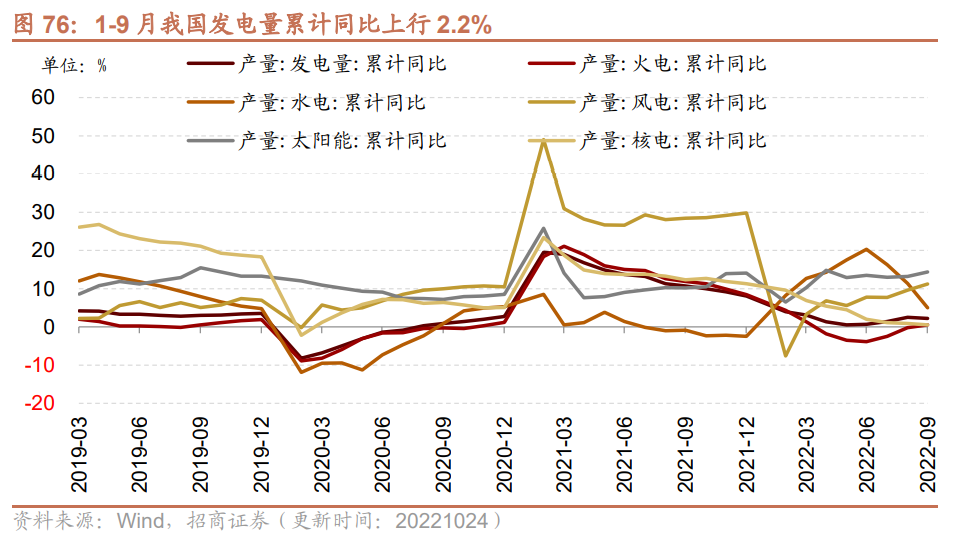 1-9月我国发电量累计同比增幅缩小,细分项目中水电、核电发电同比增幅收窄,火电发电量累计同比转正,风电、太阳能同比增幅扩大。1-9月份,我国累计发电量62867.00亿千瓦时,累计同比上行2.2%,增幅较前值缩小0.3个百分点;其中火电累计产量43694.00亿千瓦时,同比上行0.5%,增速转正;水电累计产量9507.00亿千瓦时,累计同比上行5.0%,增幅较前值收窄6.4个百分点;风电累计产量4871.00亿千瓦时,累计同比上行11.2%,增幅较前值扩大1.6个百分点;太阳能产量累计1750.00亿千瓦时,同比上行14.4%,增幅较前值扩大1.2个百分点;核电产量累计3046.00亿千瓦时,同比上行0.5%,增幅较前值缩小0.4个百分点。