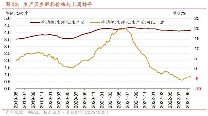 主产区生鲜乳价格持平。截至10月25日,主产区生鲜乳价格报4.14元/公斤,与上周持平,较去年同期下降3.94%。
