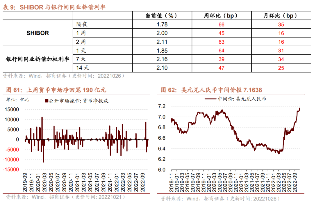 货币市场净回笼190亿元,隔夜SHIBOR利率较上周上行。截至10月26日,隔夜SHIBOR较上周上行66bp至1.78%,1周SHIBOR较上周上行45bp至2.00%,2周SHIBOR较上周上行63bp至2.11%。截至10月25日,1天银行间同业拆借利率较上周上行64bp至1.85%,7天银行间同业拆借利率较上周上行39bp至2.16%,14天银行间同业拆借利率较上周上行47bp至2.10%。在货币市场方面,上周货币市场投放100亿元,货币市场回笼290亿元,货币市场净回笼190亿元。在汇率方面,截至10月26日,美元兑人民币中间价报7.1638,较上周上行。