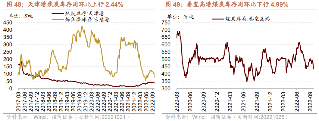 库存方面,本周秦皇岛港煤炭库存、京唐港炼焦煤库存下行,天津港焦炭库存上行。截至10月25日,秦皇岛港煤炭库存报438.00万吨,周环比下行4.99%;截至10月21日,京唐港炼焦煤库存报65.90万吨,周环比下行8.09%;天津港焦炭库存报42.00万吨,周环比上行2.44%。