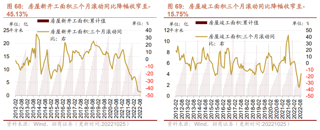 房屋新开工和竣工三个月滚动同比降幅均收窄,其中竣工端表现继续优于开工端。1-9月份房屋新开工面积累计值为9.48亿平方米,累计同比下行38.00%,较1-8月份降幅扩大0.8个百分点,三个月滚动同比降幅收窄至-45.13%(前值-45.33%)。1-9月份房屋竣工面积累计值为4.09亿平方米,累计同比下行19.90%,较前值降幅缩小1.2个百分点,三个月滚动同比降幅收窄至-15.75%(前值-29.53%) 。