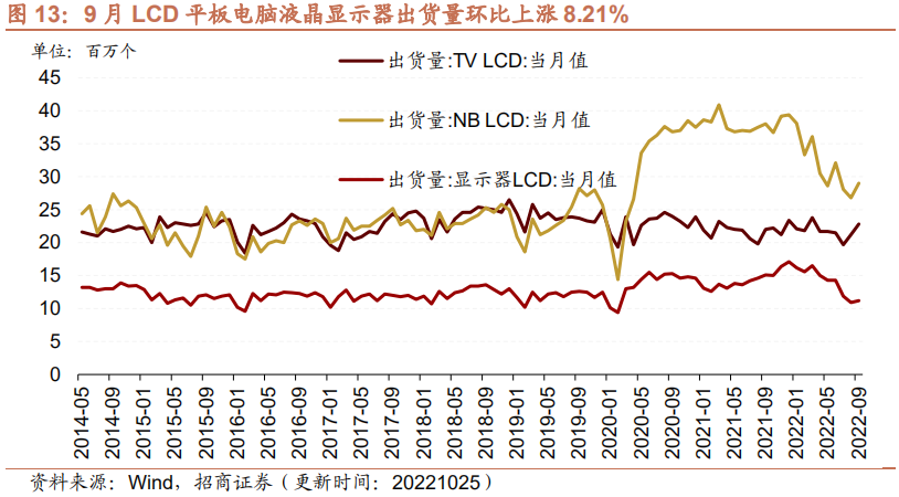 9月LCD显示器出货量环比上升,同比多数下降。9月份TV LCD出货量为22.80百万,环比增加7.55%,月同比上升3.64%;LCD NB出货量为29.00百万,环比上行8.21%,月同比下降23.68 %;LCD显示器出货量为11.20百万,环比上行2.75%,月同比下降25.83%。