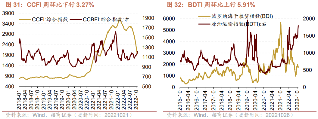 本周中国出口集装箱运价指数CCFI下行,中国沿海散货运价综合指数CCBFI上行。在国内航运方面,截至10月21日,中国出口集装箱运价综合指数CCFI周环比下行3.27%至1959.96点;中国沿海散货运价综合指数CCBFI周环比上行4.27%至 1222.54 点。本周波罗的海干散货指数BDI下行,原油运输指数BDTI上行。在国际航运方面,截至10月26日,波罗的海干散货指数BDI为1755.0点,较上周下行6.40%;原油运输指数BDTI为1793.0点,较上周上行5.91%。