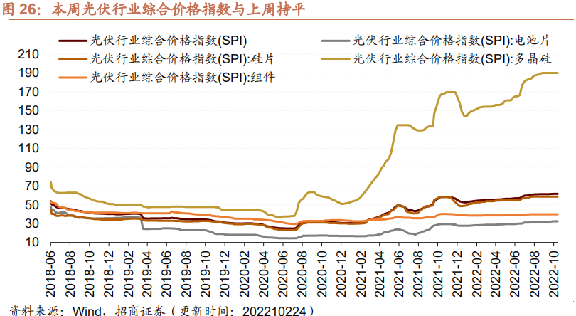 本周光伏行业综合价格指数与上周持平,多晶硅、组件、电池片、硅片价格指数保持不变。截至10月24日,光伏行业综合价格指数为61.64,与上周持平;组件价格指数维持在39.86;电池片价格指数维持在32.46;硅片价格指数维持在58.69;多晶硅价格指数维持在190.09。