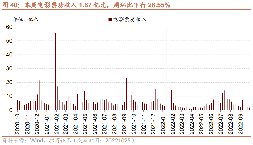 本周电影票房收入、观影人数下行,电影上映场次下行。截至10月25日,本周电影票房收入1.67亿元,周环比下行28.55%;观影人数412万人,周环比下行28.35%;电影上映155.30万场,周环比下行11.52%。