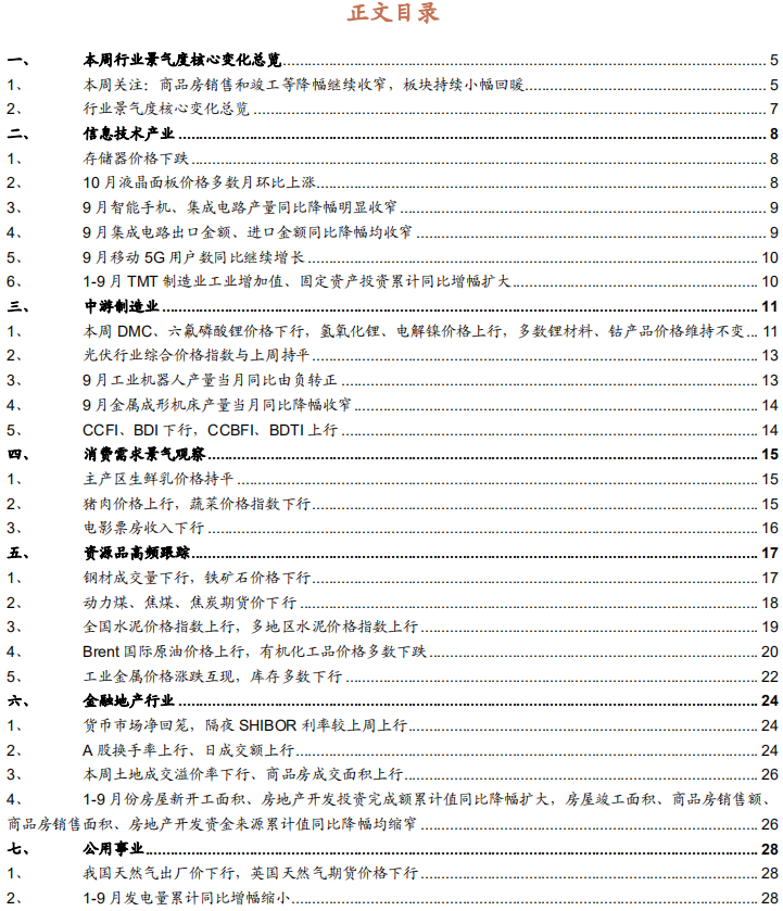 本周行业景气度继续向中下游延伸,上游资源品价格普遍疲软,仅部分工业金属与水泥价格维持涨势;中游制造板块工业机器人、金属切削机床等景气度边际改善;消费领域生猪养殖依然处于景气上行周期;信息技术领域面板、集成电路等细分板块景气度改善;此外,商品房在“保交楼”的驱动下持续回暖。推荐关注景气度持续回暖的地产产业链、工程机械以及边际向好的面板、集成电路等细分领域。