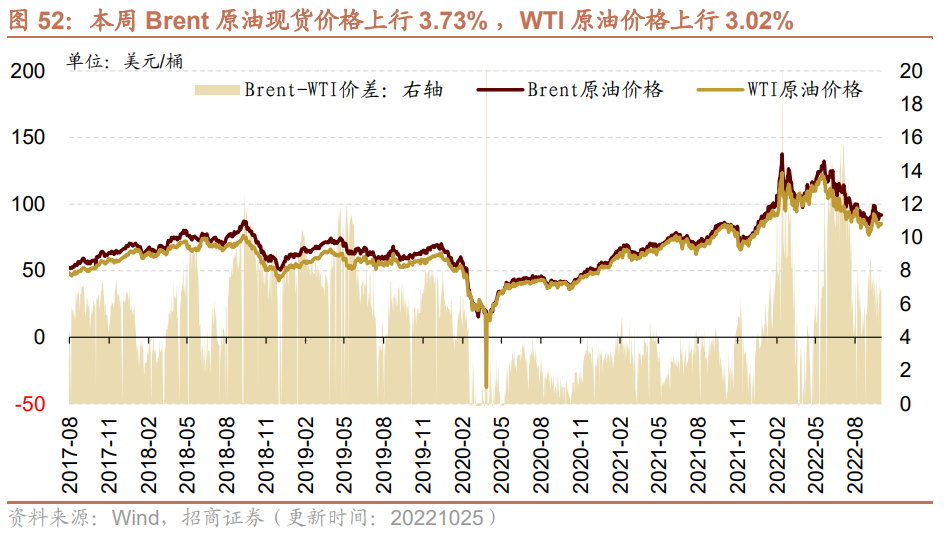 Brent国际原油价格上行。截至2022年10月25日,Brent原油现货价格周环比上行3.73%至91.79元/桶,WTI原油价格上行3.02%至85.32美元/桶。在供给方面,截至2022年10月21日,美国钻机数量当周值为771部,周环比上行0.26%;截至2022年10月14日,全美商业原油库存量周环比下行0.39%至4.37亿桶。