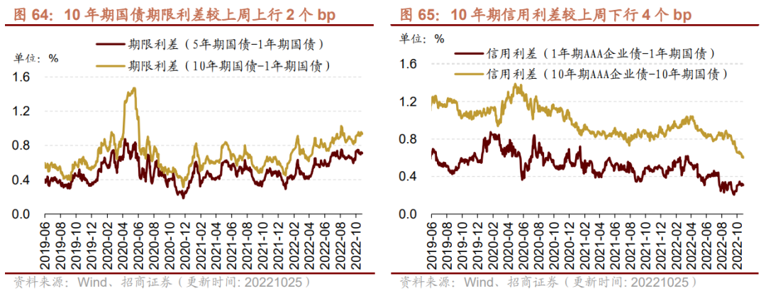 在债券收益率方面,6个月/3年国债到期收益率较上周上行。截至10月25日,6个月国债到期收益率较上周上行9bp至1.76%;1年国债到期收益率较上周持平,3年期国债到期收益率较上周上行2bp为2.29%。5年期债券期限利差较上周持平;10年期债券期限利差较上周上行2bp至0.93%;1年期AAA债券信用利差较上周持平;10年期AAA级债券信用利差较上周下行4bp至0.60%。