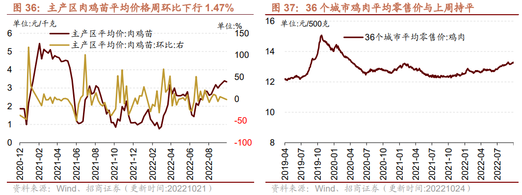 在肉鸡养殖方面,肉鸡苗价格下行,鸡肉价格与上周持平。截至10月21日,主产区肉鸡苗平均价格为3.34元/羽,周环比下行1.47%;截至10月24日,36个城市平均鸡肉零售价格为13.26元/500克,与上周持平。