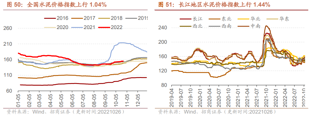 水泥价格方面,本周全国水泥价格指数上行,长江、华东、西南、中南地区水泥价格指数上行,华北、西北地区水泥价格指数下行,东北地区水泥价格指数持平。截至10月26日,全国水泥价格指数为154.89点,周环比上行1.04%;长江地区水泥价格指数周环比上行1.44%至152.14点;东北地区水泥价格指数为143.00点,与上周持平;华北地区水泥价格指数为161.78点,周环比下行0.14%;华东地区水泥价格指数为153.87点,周环比上行1.24%;西北地区水泥价格指数为152.34点,周环比上行2.45%;西南地区水泥价格指数周环比上行0.46%至152.69点;中南地区水泥价格指数为157.49点,周环比上行1.69%。截至10月20日,浮法玻璃市场价为1734.30元/吨,旬环比上行0.97%。