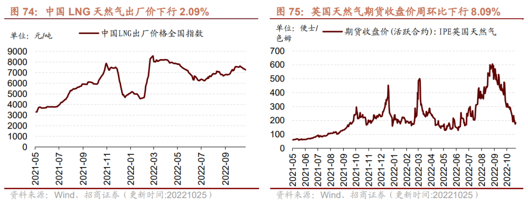 我国天然气出厂价下行,英国天然气期货结算价下行。截至10月25日,我国天然气出厂价报7268.00元/吨,较上周下行2.09%;截止10月25日,英国天然气期货结算价收于185.20便士/色姆,较上周下行8.09%。