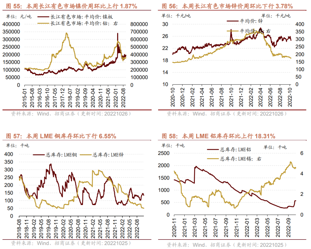 库存方面,铝、锡库存上行,铜、锌、铅、镍等库存下行。截至10月25日,LME铜库存较上周下行6.55%至134400.00吨;LME铝库存较上周上行18.31%至569500.00吨;LME锌库存本周下行2.73%至49825.00吨;LME锡库存周环比上行0.33%至4565.00吨;LME镍库存52908.00吨,较上周下行2.51%;LME铅库存较上周下行4.78%至28400.00吨。