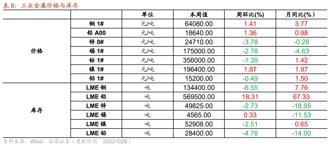 本周工业金属价格涨跌互现,铜、铝、镍等价格上涨,锌、锡、钴等价格下降。截至10月26日,铜价格64080元/吨,较上周上行1.41%;铝价格较上周上行1.36%至18640元/吨;锌价格为24710元/吨,较上周下行3.78%;锡价格较上周下行2.78%为175000元/吨;钴价格较上周下行1.39%为356000元/吨;镍价格较上周上行1.87%至196400元/吨;铅价格15200元/吨,较上周下行0.49%。