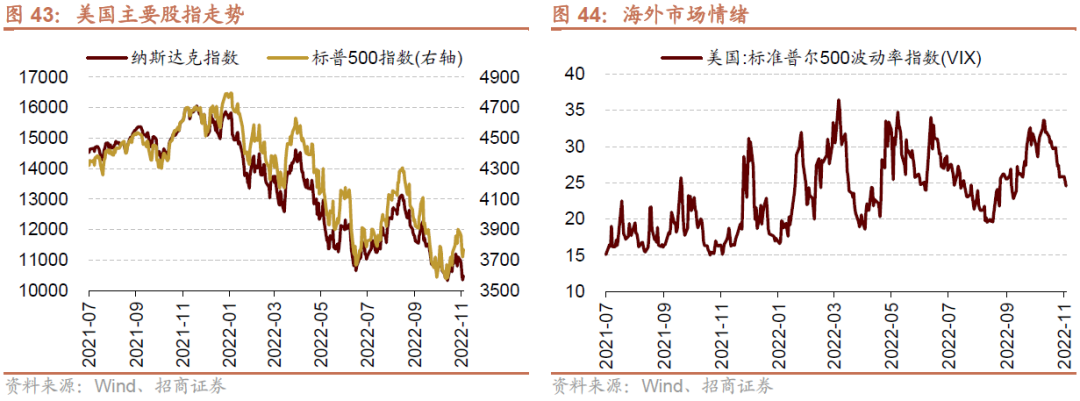 上周VIX指数回落,全周较前期(10月30日)下降1.20点至24.55,市场风险偏好改善。美国10月非农就业仍超预期,美联储官员在加息75bp后表示明年利率峰值可能超过5%,后续加息路径不确定性上升,上周标普500指数下跌5.65%,纳斯达克指数下跌3.35%。