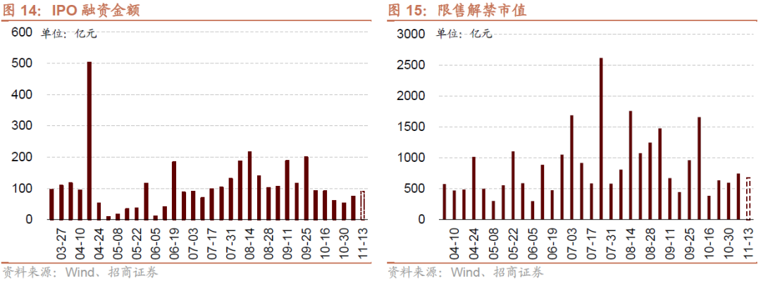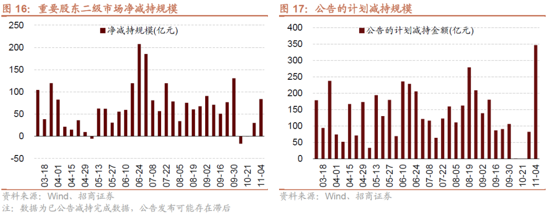 资金需求方面,10月31日-11月4日,IPO融资金额回升至74.6亿元,共有8家公司进行IPO发行,截至11月7日公告,未来一周将有10家公司进行IPO发行,计划募资规模90.9亿元。重要股东净减持规模扩大,净减持83.7亿元;公告的计划减持规模346.6亿元,较前期上升。