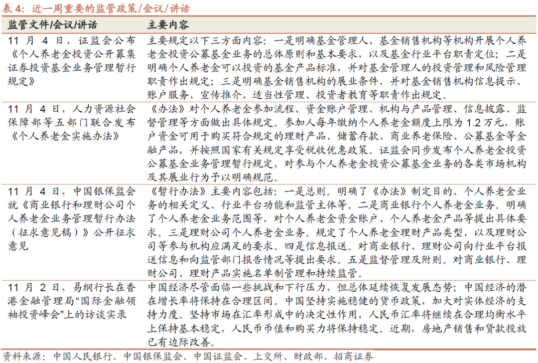 多部门密集出台4项个人养老金政策,个人养老金制度正式落地实施,我国养老金第三支柱发展将迈入全新阶段。根据目前政策安排,国内个人养老金将主要通过投资各类养老金融产品而间接投资于股票市场,养老金投资注重投资的稳健长期性,有望为股市带来中长期增量资金。上周A股二级市场可跟踪资金由前期净流出转净流入,股市流动性改善。海外方面,美联储如期加息75bp,美债收益率和美元指数有筑顶迹象。外部流动性环境改善和北上资金回流有望对A股形成正面支撑。
